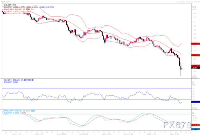 周一(9月26日)美元兑一篮子货币=USD上涨0.804%,报114.05,稍早触及2002年5月以来最高114.58。欧元兑美元也触及0.9528美元的20年新低,尾盘下跌0.81%。在经济方面,欧元区9月份制造业PMI初值为48.5%,服务业PMI初值为48.9%,综合PMI初值为48.2%,均明显低于50%临界水平,欧元区经济显现衰退迹象。而且随着欧洲能源危机发酵,欧元兑美元的弱势仍难以得到缓解。技术层面上,日图跌破0.9800一线加速下行,外汇分析整体仍看跌。4小时图短期均线系统空头排列,下行动能猛烈但在20年来低位0.9550得到一定的空头回补盘推动暂时获得反弹喘息的机会。日线级别图上布林带喇叭口扩张,欧元的跌势明显,上方初步阻力在0.9700,继而是0.9833。下方关键支撑在隔夜低点0.9553,若跌穿历史的低位纪录恐会继续创出。外汇分析近期预料该货币对将会进入区域震荡整理走势,区间主要在0.95-0.98之间。