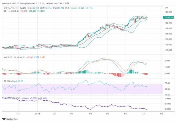 昨天的东京证券市场,在世界范围的经济衰退预期增强的背景下,日经平均指数时隔3天呈现下行走势,大幅下跌至26100日元一线附近收盘。前一天的美股市场上,由于欧洲股市全面下跌,NY道琼斯指数一度下跌超过700美元。虽然尾盘反弹收盘,但对于世界经济衰退的担忧高涨,市场情绪恶化非常明显。原油价格的急速下跌,也带动了资源类股的抛售。外汇市场上虽然美元兑日元汇率小幅振荡,但是之前中长期日元贬值趋势有所缓和,也成为压制了东京股市的整体走势。日经指数尾盘勉强站稳26000日元整数位一线收盘。进入欧美交易时间,当天公布的美国ISM非制造业景气指数超出了市场预期使得对美国经济衰退的担忧有所缓和,美股开盘小幅上升。尾盘在公布的6月份 FOMC会议纪要内容中,美联储对当前劳动市场和消费表现出乐观的见解,并提出了按计划继续实施加息进程的方针。市场整体避险情绪放缓,NY道琼斯指数最后小幅收高在31000美元一线附近。受此影响,日经指数期货晚盘也呈现小幅反弹走势,在26200日元一线收盘。